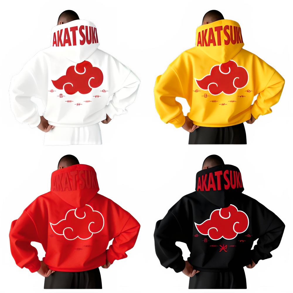 The crimson cloud design is a legendary emblem in the Naruto universe—associated with the Akatsuki and the unforgettable presence of characters like Itachi Uchiha, Pain (Nagato), Konan, Kisame, Deidara, Sasori, Kakuzu, and Hidan. This hoodie captures that signature aesthetic in a wearable format that’s easy to style with jeans, joggers, cargos, or layered looks.