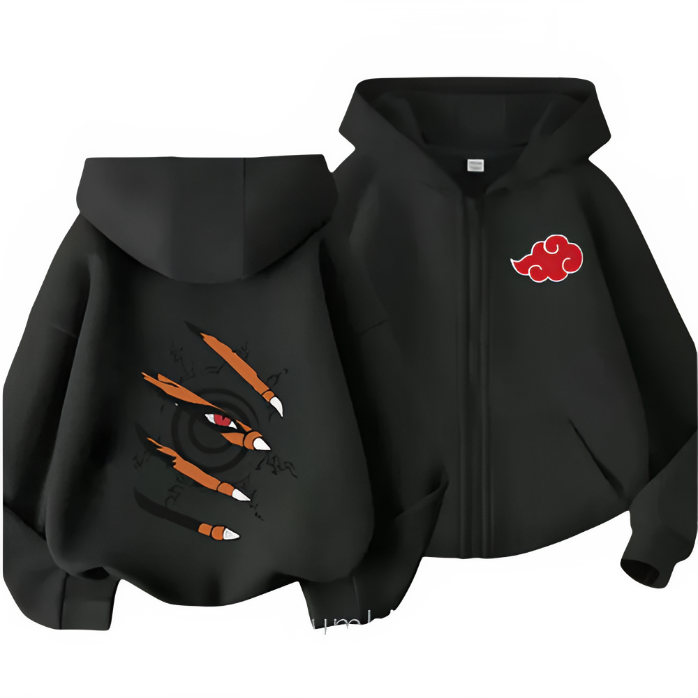 Tobi’s warped spiral mask design is instantly recognizable, making this hoodie an easy choice when you want anime fashion that reads clearly without needing extra accessories. The graphic style pairs well with casual fits—jeans, joggers, cargos, or layered over tees—so you can wear it as a statement piece or as part of a full Naruto-inspired outfit. If you like darker anime aesthetics, Akatsuki energy, and masked-ninja symbolism, this zipper hoodie fits right in.